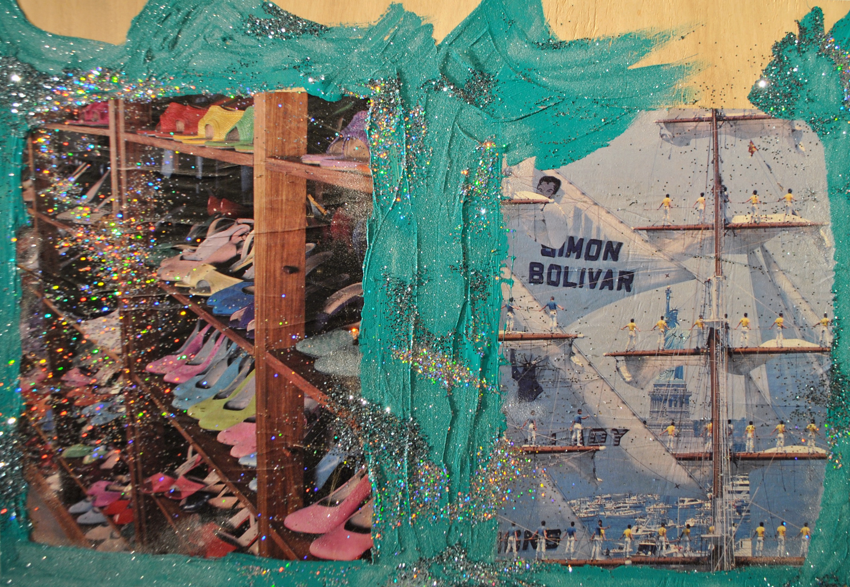 acrylic, glitter and paper on wood panel